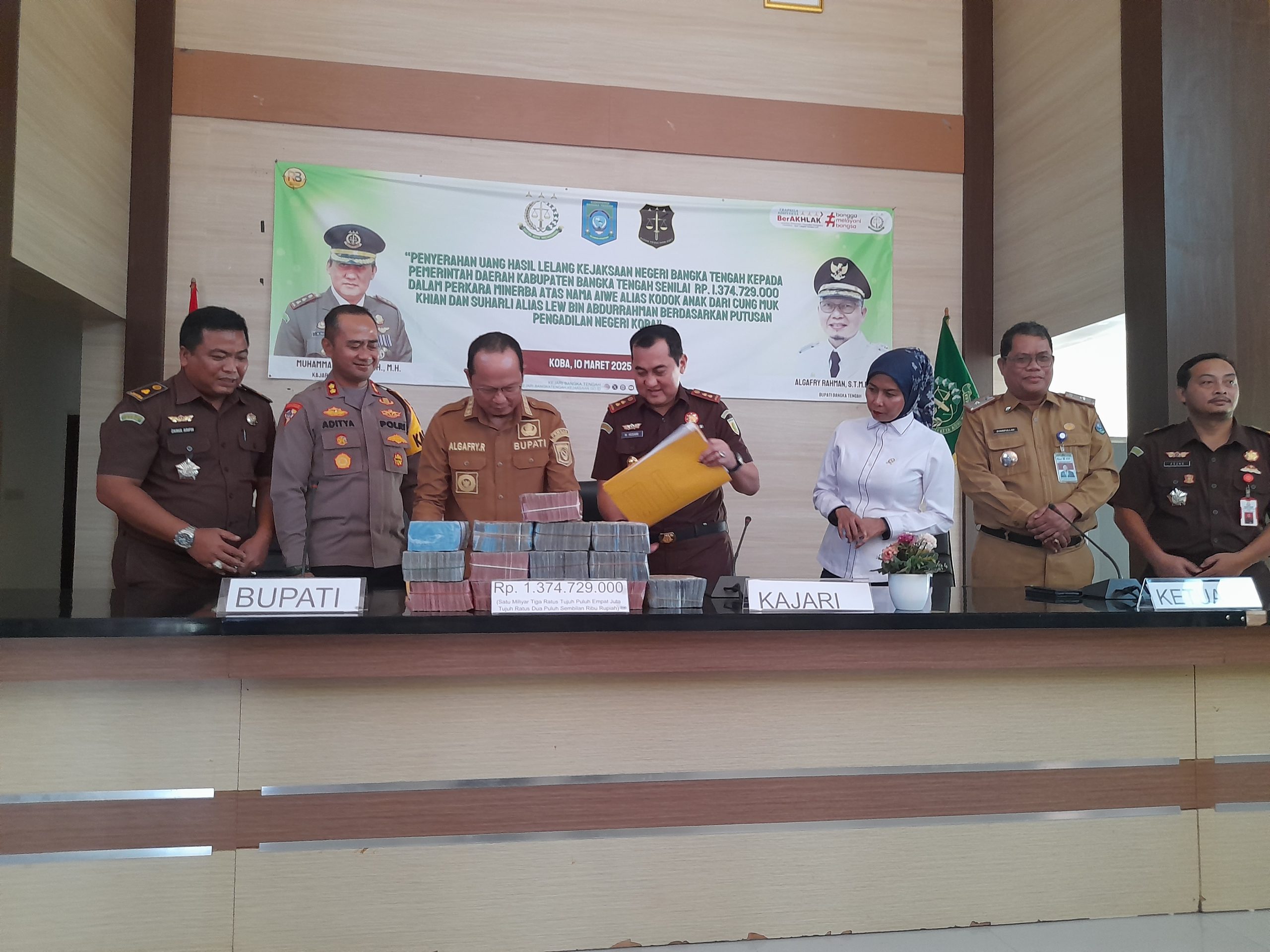 KOBA – Kejaksaan Negeri (Kejari) Bangka Tengah (Bateng) menyerahkan uang hasil lelang dalam perkara minerba atas nama Aiwe alias Kodok anak dari Cung Muk Kwian dan Suharli alias Lew bin Abdurrahman, Dkk. sebesar Rp1.374.729.000 kepada Pemerintah Daerah Kabupaten Bangka Tengah.